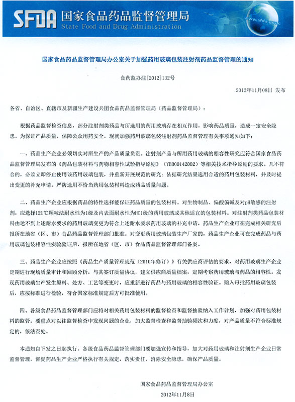 国家食品药品监督管理局办公室关于加强药用玻璃包装注射剂药品监督管理的通知