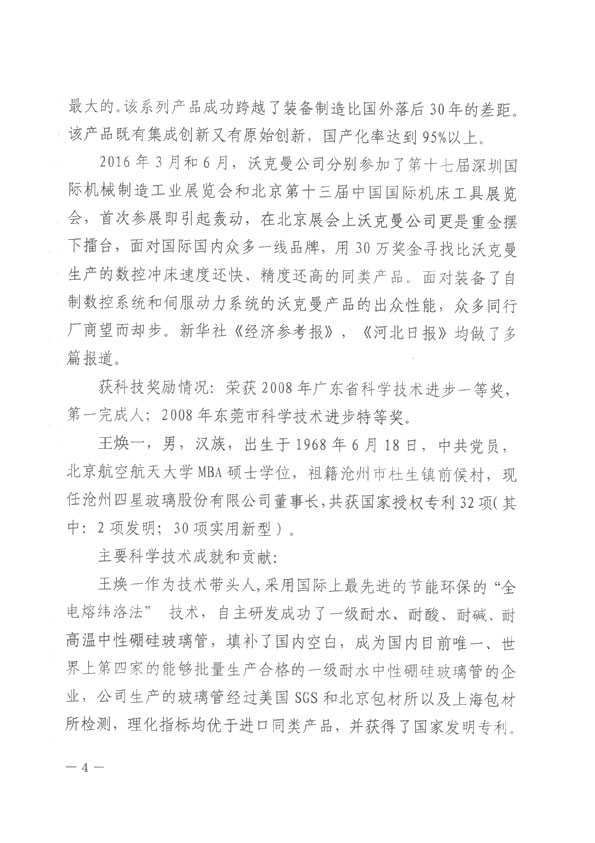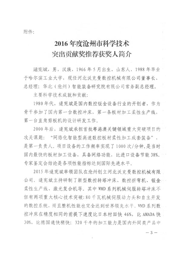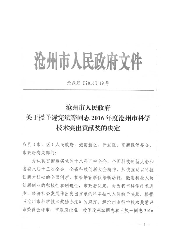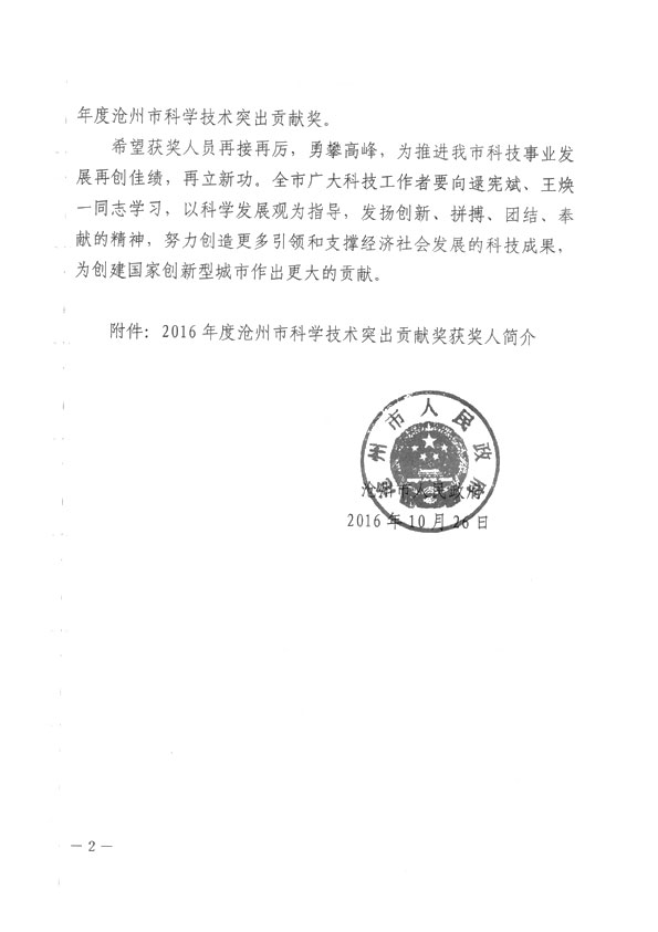 沧州市人民政府授予王焕一先生2016年科学技术突出贡献奖
